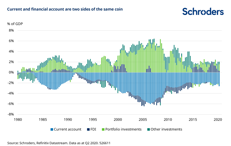 Historically, the relationship between the US current account and the dollar has not been clear cut. The US has run a persistent current account deficit, on average around 2.5% of GDP, since 1980, but this has not been an obstacle to the dollar going through periods of very strong growth.