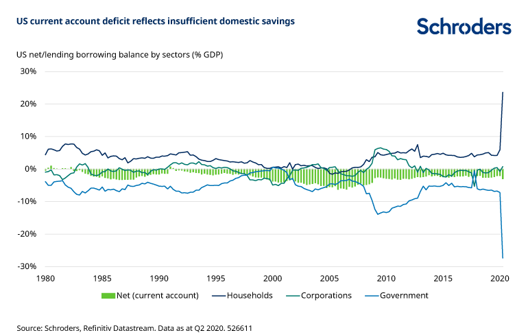 What can the US current account tell us about the value and the likely direction of the dollar? Before the Covid-19 shock, the monthly US goods or trade deficit was around $70 billion. This is close to the levels seen just before the financial crisis. Given that the US economy is much larger now, this in itself should not be too alarming for the dollar.