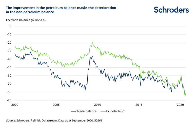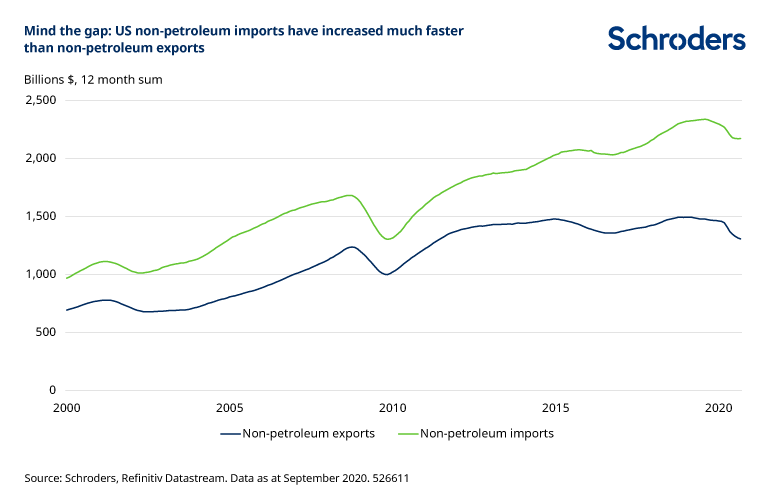 Specifically, annual imports of non-petroleum goods have increased by half a trillion dollars, while exports are more or less unchanged. Furthermore, the gap between exports and imports started to widen in 2014. Even though the exact extent is debatable, the strong dollar and the 2017 US tax cuts have contributed to the deterioration of the non-petroleum balance. A stronger currency made US exports less competitive, while the tax cuts fuelled imports. This led to an annual non-petroleum trade deficit of more than $800 billion.