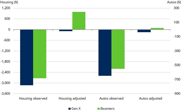 Generational spending - millennials compared to other generations (before and after adjustments1, 2016)
