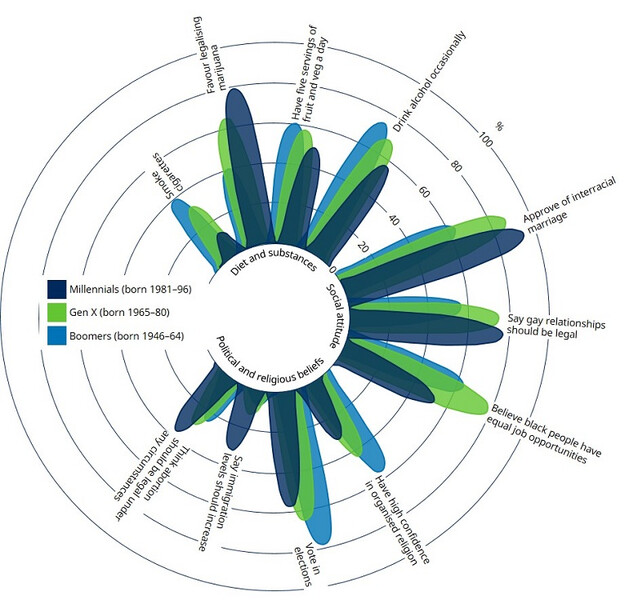 So on a range of variables, far from bucking the trend, millennials are resoundingly conforming to it. How disappointing!