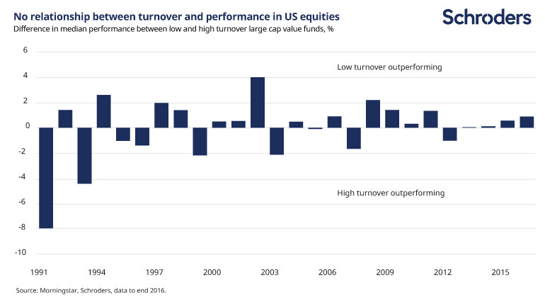 This is not just an assertion. We have spent some time analysing the link between portfolio turnover and excess returns among US-domiciled active equity funds (Churn is not necessarily burn: debunking the myths of portfolio turnover, Schroders, July 2017*) and our research dispels this myth. We found no evidence of a structural relationship between turnover and excess returns among active US equity funds over the 1991-2016 period. This can be seen in the chart below, which shows the difference each year in returns of the median high-turnover US value fund and the median low-turnover fund. Sometimes low turnover funds outperform and sometimes high, without exhibiting any real pattern. Statistical analysis confirms the lack of relationship. This conclusion holds over both one- and three-year investment horizons.
