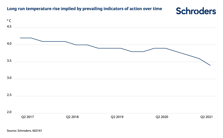 The latest reading of Schroders’ Climate Progress Dashboard points to a long run temperature rise of around 3.4 degrees over pre-industrial levels.