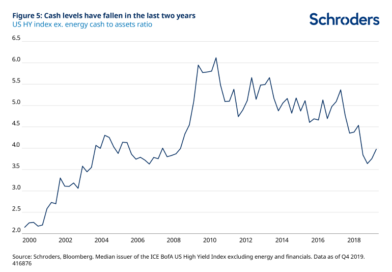 However, with the spread of the coronavirus and increased uncertainty, this could change, with liquidity, cash held on the balance sheet, becoming key. Unfortunately, cash levels have fallen in the last two years in US HY (Figure 5). The impact of coronavirus may well force companies to spend down their cash reserves, ultimately leading to rising defaults outside the energy sector, especially if the shock turns out to be more than transitory.