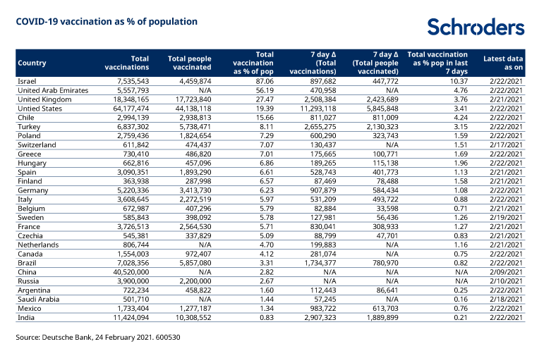 Meanwhile, countries in parts of Central Eastern Europe are also faring relatively well, having vaccinated about 7% of their populations as they access European Union vaccine supplies. There has also been a positive surprise in Turkey where the rate of vaccination is accelerating.