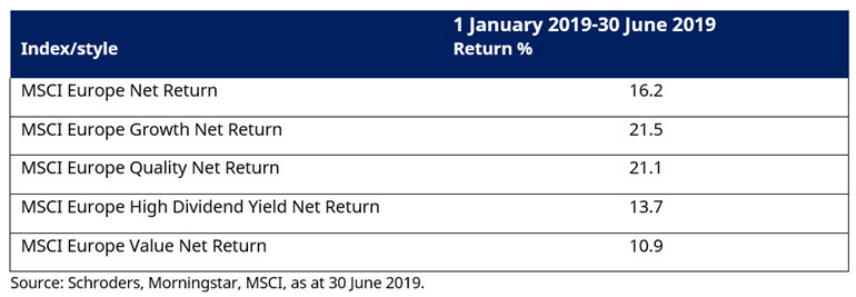 We looked at the return for the overall index - MSCI Europe – and then for four style factors within this index: growth, quality, high dividend yield and value.