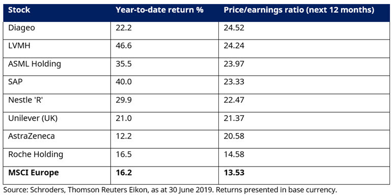 There is considerable overlap between the MSCI Europe Quality and Growth indices. The table below shows eight stocks that are among the top ten constituents by size in both indices, and the returns posted by these stocks in the six months to the end of June. Only AstraZeneca has failed to outperform the broader MSCI Europe index.