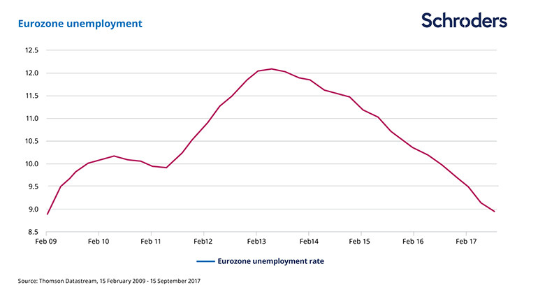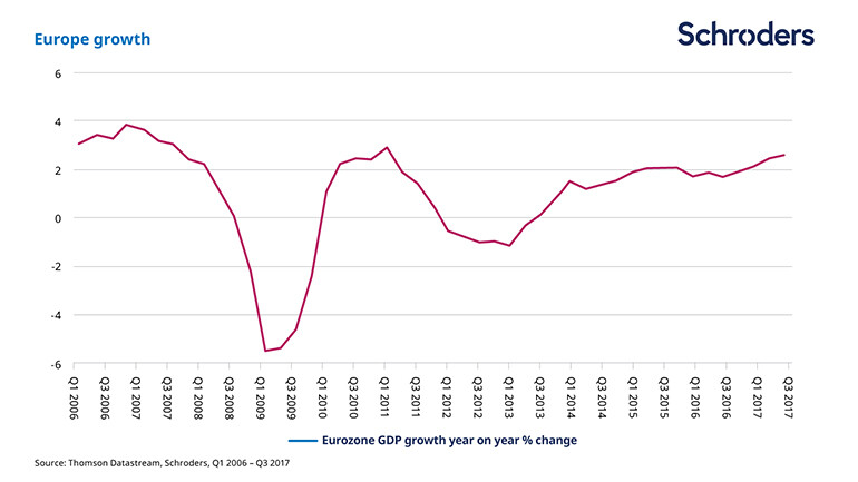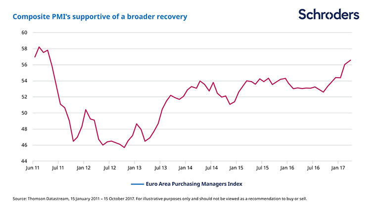 The European economic recovery is gathering pace. The most recent GDP numbers from the eurozone have been strong with year-on-year growth of 2.6% in the third quarter. Forward-looking surveys such as industrial and services confidence and purchasing managers’ indices (PMIs) are all pointing in the right direction, implying growth is on track.