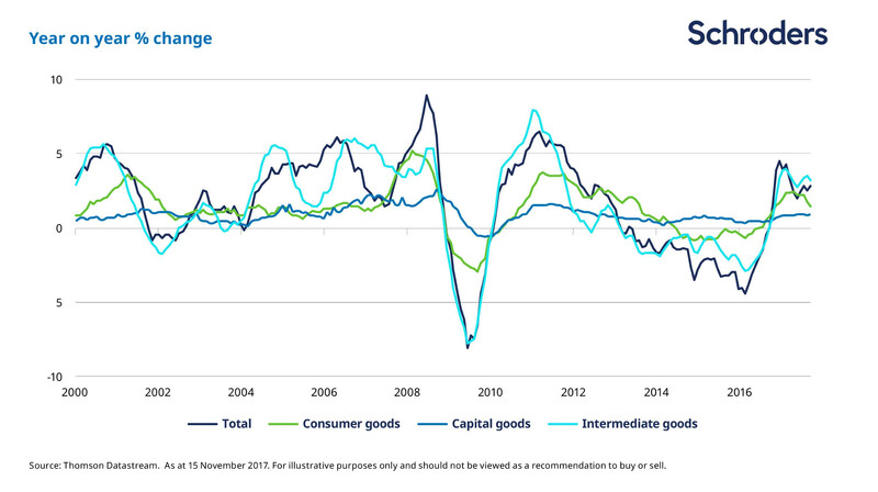 The picture for European corporates remained bright with profit margins improving. The chart below shows that deflation of producer prices – sometimes referred to as factory gate prices – is at an end. Prices started rising towards the end of 2016 and have largely been on an upward trend ever since.