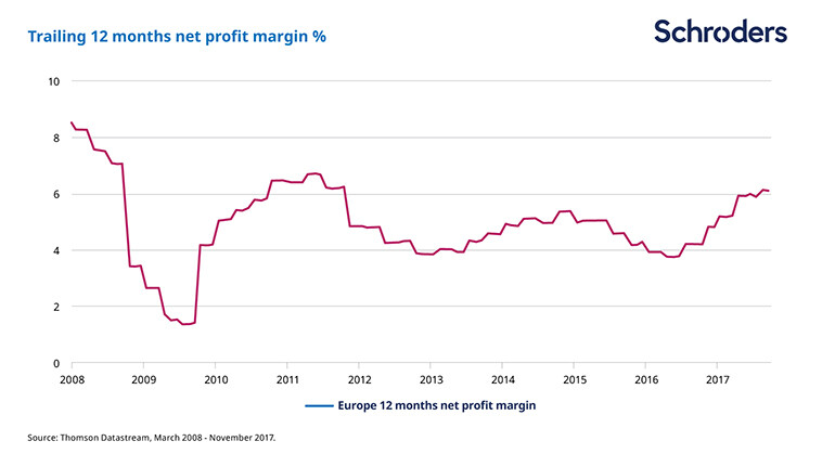 The better economic backdrop is helping to support demand. In turn, corporate profitability has been improving in Europe. This is partly due to better pricing power (i.e. the ability of firms to raise prices without denting demand). It is also due to operational leverage as spare capacity in the economy is utilised, meaning companies can produce more while keeping costs stable.