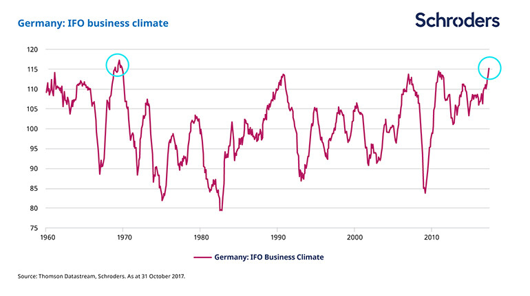 Economic news continued to be encouraging, with forward-looking indicators suggesting a pick-up in growth. The German Ifo business climate survey reached highs not seen since 1969, and went on to surpass its previous peak by the end of the year.