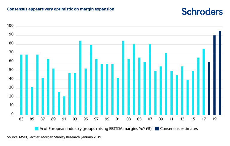 The chart below from Morgan Stanley shows the proportion of European industry groups whose profit margins 4 grew year-on-year since the early 1980s, and the proportion of those forecast by sell-side analysts (the “consensus”) to grow profit margins in 2018, 2019 and 2020. It seems expectations are very high, with consensus forecasting 90% or more of industry groups to grow margins of EBITDA (a measure of profits) in both 2019 and 2020.