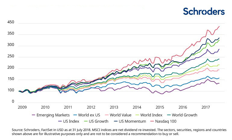 Prior to the fall in stock markets in late 2018 managers from the Schroder Global Value Equity Team flagged the below chart, alongside an article which investigated the sustainability of ever-higher “price/earnings multiples” for technology stocks. These include the so-called “FAANG” stocks of Facebook, Amazon, Apple, Netflix and Google. You can visit The Value Perspective website here for details of this analysis.