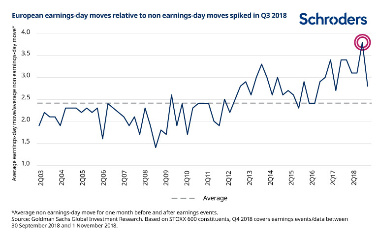 During Q3 2018, the ratio spiked to its highest level since Goldman Sachs began tracking the data in 2003. This occurred as an increasing number of shares experienced extreme price moves on results day, in sharp contrast to the otherwise calm market conditions, and, in many cases, despite earnings being in line with expectations.