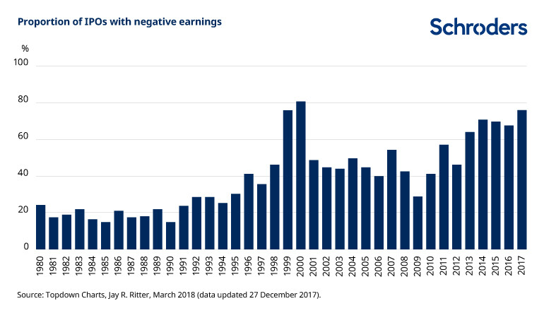 In another potential sign of complacency, equity investors have been increasingly prepared to back speculative initial public offerings (IPOs)5 as the market cycle has progressed. The chart below tracks the proportion of IPOs with negative earnings, and contains another important message, believes the Schroder Global Value Equity Team.