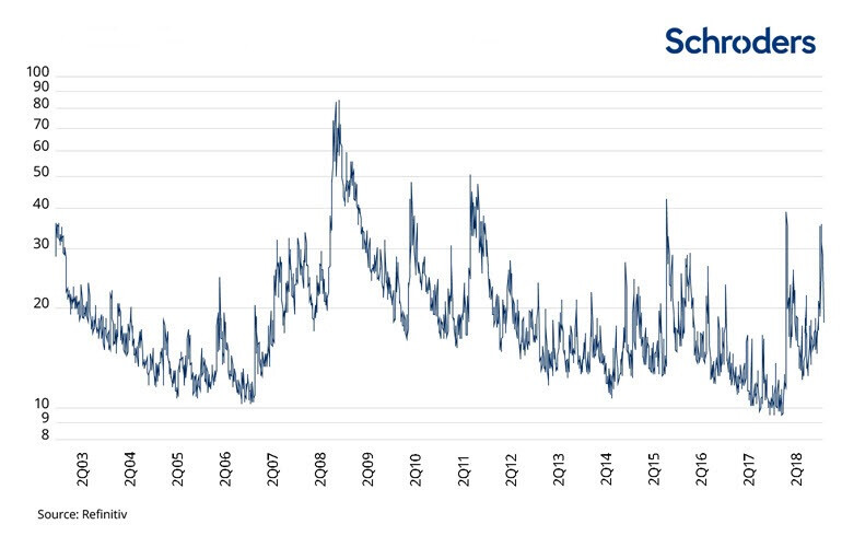 Market-wide volatility picked up sharply at the end of 2018, with the Chicago Board Options Volatility Index (VIX), called the market’s “fear gauge”, spiking above 30 in December (see chart, below). The VIX reflects the amount of volatility traders expect for the US’s S&P 500 during the next 30 days. Rising market-wide volatility has, in the past, predicated periods of both negative (and positive, depending on the severity of the volatility) performance for markets, as explained by Schroders’ article here.