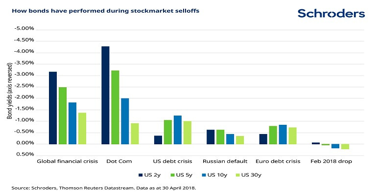 History can provide some help here. Despite the unsettling experience of February, it is worth remembering that bonds have been an excellent hedge against most of the major equity sell-offs over the past three decades or so, as our chart below shows.