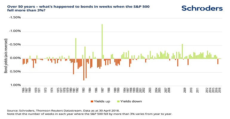 Of course, the last 30 years may not be the best pointer to the future. In the next chart, we have looked back over more than half a century to 1964 to see the shift in the US 10-year yield during weeks when the S&P 500 equity index fell by more than 3%. From this we can calculate that US Treasury bonds, seen by many as one of the safest investments an investor can make, helped to protect against large weekly moves in equities more than 70% of the time.