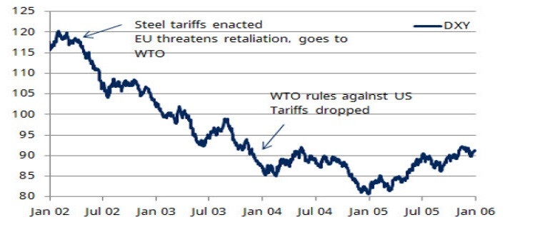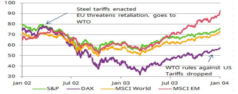 In March 2002 President George W Bush announced steel tariffs of 8-30%, scheduled to remain in effect until 2005. Canada and Mexico were exempt. The EU immediately threatened (but did not enact) retaliatory measures, and went to the World Trade Organization (WTO). The WTO ruled against the US in December 2003 and the US dropped its tariffs rather than face retaliation from the EU.