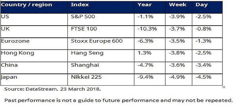 The table below shows the performance of a variety of regional stockmarkets up until the morning of 23 March 2018 (apart from the US which shows performance to the market close on 22 March).