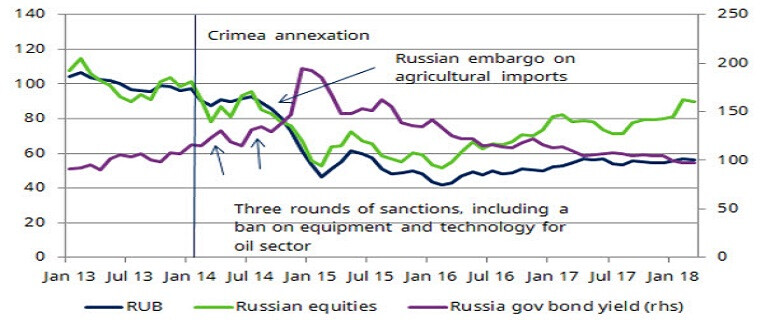 An alternative recent example was in Russia in 2014, though this was a case of sanctions, which included trade measures, rather than tariffs. The chart below shows the performance of the rouble, Russian equities and Russian bonds. There were definite impacts on all of them.