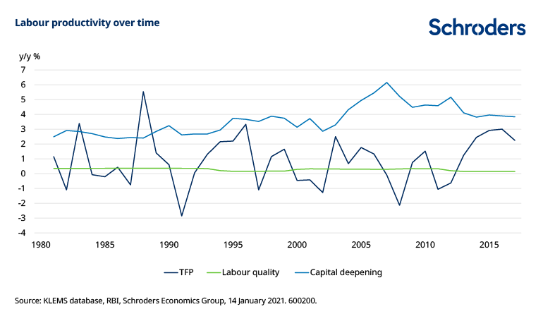 In order to form a view on labour productivity, we must dig a bit deeper into its three drivers. The first driver of productivity is education which can be viewed as the quality of labour. The second driver is how much capital each worker has, known as capital deepening. In our calculations of capital deepening, we also include how well the existing stock of capital is used. The third driver is how well capital and labour are combined to form output. This is known as total factor productivity (TFP). Given that TFP is unobservable, it is often the residual in calculations and can be thought of as the growth in output that improvements in capital and labour cannot explain.