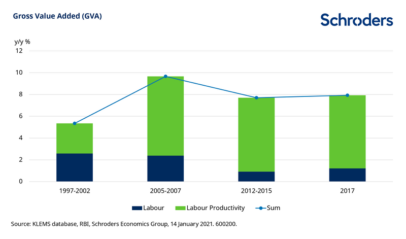 We use Gross Value Added (GVA) data from the Reserve Bank of India (RBI) to break down economic growth into its two supply components; workers (labour) and the amount of output each worker produces (labour productivity). Though the accuracy of data is questionable, it still does a good job of telling the story.
