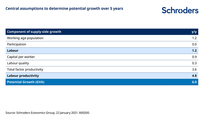 Putting this together, we assume labour growth of 1.2% per year and labour productivity growth of 4.8% per year. This points to our estimate of potential growth being around 6% for the next five years. This is lower than other estimates from international bodies like the IMF who pencil in 7.3%. Though the IMF do not provide a breakdown of their assumptions, this is most likely due to our more pessimistic central outlook on labour productivity growth.