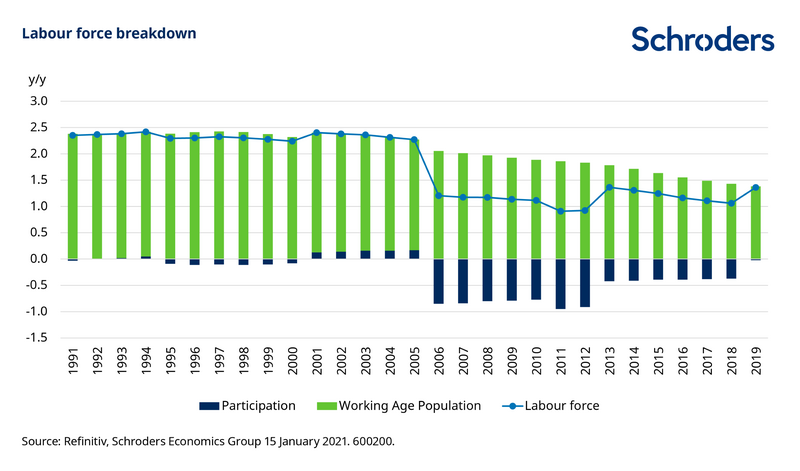 But while labour productivity has continued to grow around this rate during the last decade, there has been a slowdown in the contribution of labour. This is likely surprising to investors who will no doubt be familiar with India’s favourable demographics, often dubbed its “demographic dividend”.