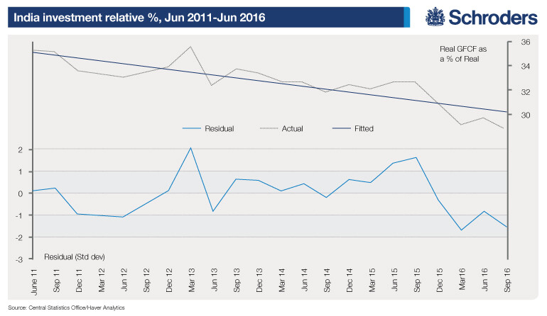 However, we hope the potential for falling interest rates (see second chart below), the final clear-out of bad assets in the public banks and fiscal consolidation will, once the effects of demonetisation have washed through, allow for a pickup in investment and stronger economic growth.