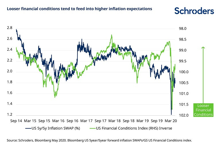 However, as the chart demonstrates, historically, loosening financial conditions (taking into account interest rates, the US dollar exchange rate, equity prices and corporate bond levels) have tended to result in rising inflation expectations. While the March crisis and liquidity squeeze saw a sharp tightening in financial conditions, this has quickly reversed and conditions are once again loosening.