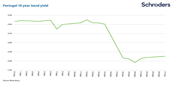 The yield on Portugal’s 10 year government debt fell sharply in September from 2.83% to 2.39% as S&P increased the country’s credit rating from BB+/B to BBB-/A-3. Bond yields fall when prices rise.