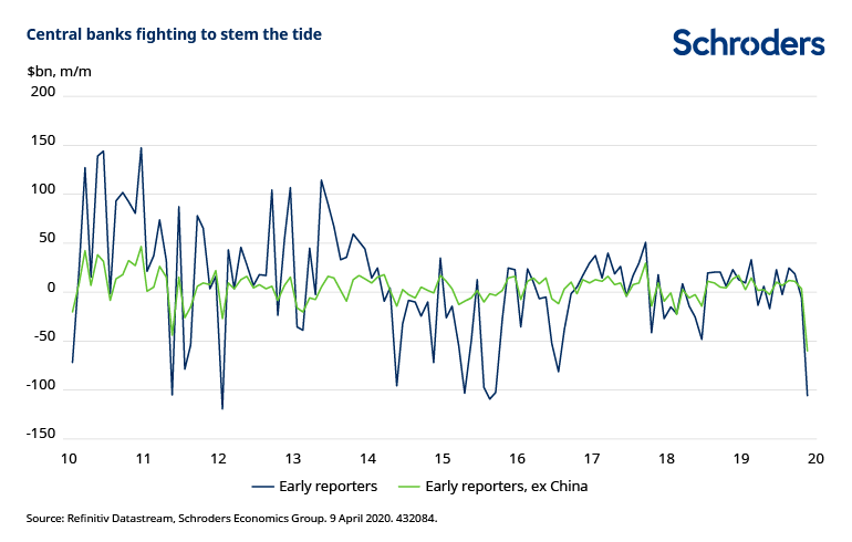 We are also beginning to see some evidence of capital outflows in the reserves data, with a sharp fall in the figures from nine early reporters for March. The fall, particularly ex-China, is far in excess of normal monthly volatility, and even for China marks a break from the last three years. This suggests currency weakness would be greater if not for central bank intervention