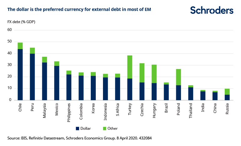 Dollars are important to EM because the currency has become increasingly dominant in both global trade and finance. The bulk of EM trade, for example, is invoiced in dollars, meaning economies could begin to struggle to buy essential imports of food and energy.