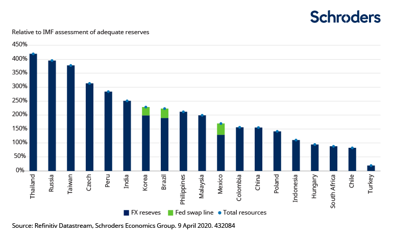 The question for investors might then be which EM economies have sufficient resources to survive in the face of so many coincident pressures. Countries will need hard currency reserves sufficient to cover lost revenues from exports, to cover essential imports, counter capital flight, repay or rollover maturing debt and to at the very least smooth the volatility in their exchange rates.