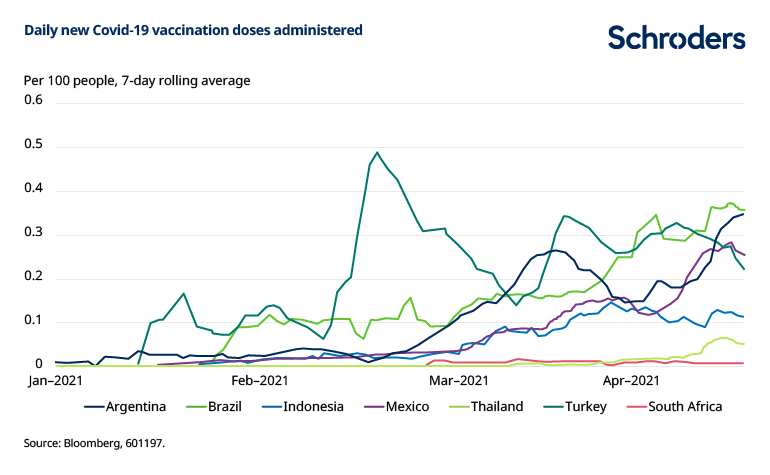 Emerging market vaccination rates have badly lagged the developed world. Individual countries have struggled to get to grips with the pandemic and in India particularly it remains severe. We are, however, finally getting indications that the situation is improving in some countries (see chart).
