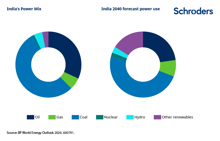 As the next charts show, the majority of India’s current energy mix comes from coal. These figures do not capture rural fuel sources, or for those without connection to the electricity grid or transport links to get bottled liquid petroleum gas (LPG)s. The International Energy Agency estimates these fuel sources to be worth about 20% of formal fuel sources. India needs to replace these energy sources with electric power or gas. And it will need to grow.