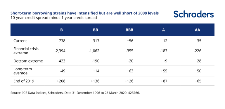The disruption and risk aversion resulting from the coronavirus pandemic has caused any number of extreme and unusual events across financial markets. Among these we now have an inversion of the corporate bond credit spread curve, as the bond market sees a significant risk of companies facing near-term financial pressures amid reduced economic activity.