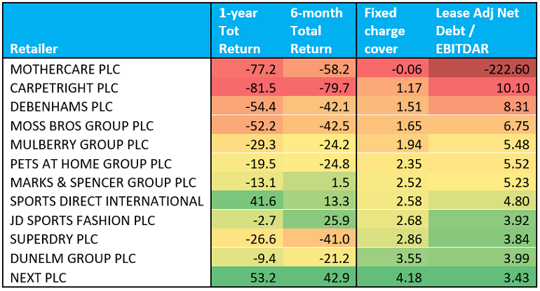 As you can see, there is a huge correlation. All the companies with a fixed charge cover of less than 2x saw their share price fall - mostly by a half or more - over the last 12 (and often just six) months.
