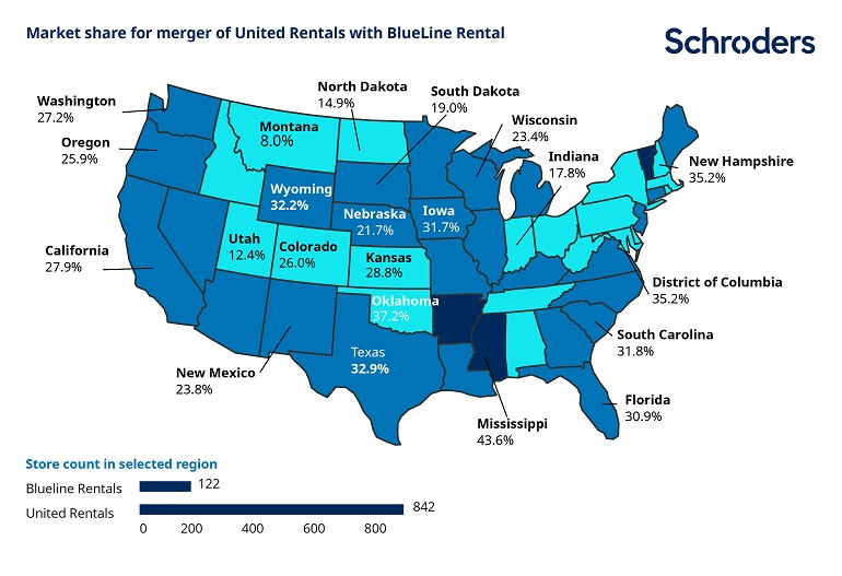The analysis highlighted that BlueLine was an attractive acquisition target for rival firms, given its market share in areas experiencing high construction growth. The map below shows the percentage of the market that the BlueLine and United Rentals estate would have if they were to merge.