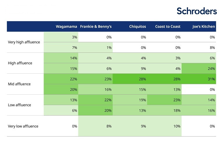 Using demographic data and store catchments, the affluence of local populations was mapped to each Wagamama and Restaurant Group location. This analysis showed that Wagamama’s locations were in complementary positions to the Restaurant Group portfolio, and that different kinds of customers went to different restaurants. This meant that the combined entity would be unlikely to cannibalise clientele of the existing Restaurant Group locations.