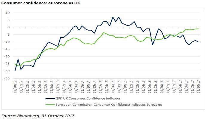 In October, eurozone consumer confidence actually hit a 16-year high. No great surprise. Economic growth in Europe looks good but inflation remains below target. This means that although the European Central Bank has confirmed it will slow quantitative easing - gradually turning off the liquidity taps – it has not increased its main interest rates.