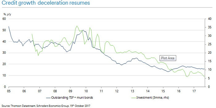 Growth in China’s total social financing (TSF), a broad measure of lending by both the official and shadow banking sectors, has steadily been falling along with that of investment over the past few years. It is no coincidence that along with this slowdown has come a moderating pace of GDP growth too – which had previously been over-reliant on credit and investment