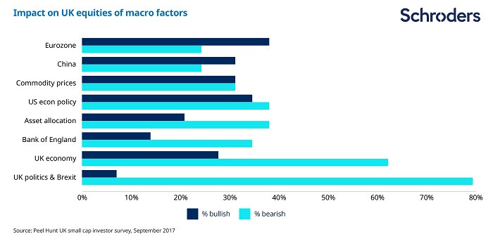 Based on a survey of UK small cap investors by Peel Hunt, it reveals where respondents stand as a whole – net bullish or bearish – on a number of macroeconomic factors seen as impacting the market. Domestic concerns dominate, with respondents most bearish about UK politics and Brexit, the UK economy and the Bank of England (BoE).