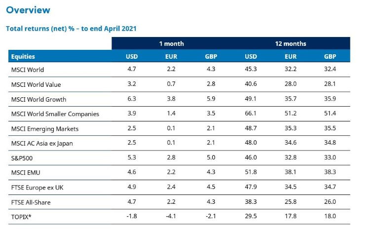 - Developed market equities gained in April with the US leading the way, buoyed by a swift vaccine roll-out and fiscal stimulus measures.
