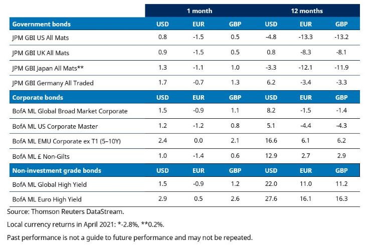 The sharp sell-off in US government bonds came to a halt in April, helped by comments from the Federal Reserve (Fed). European yields rose (i.e. prices fell), continuing to diverge from the US, due to rising growth and inflation expectations. With continued optimism over the economic recovery, corporate and emerging market bonds performed well and the US dollar weakened.