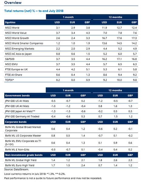 - Equity markets were generally higher in July, with a busy corporate reporting period indicating strong earnings across a number of geographies and sectors.