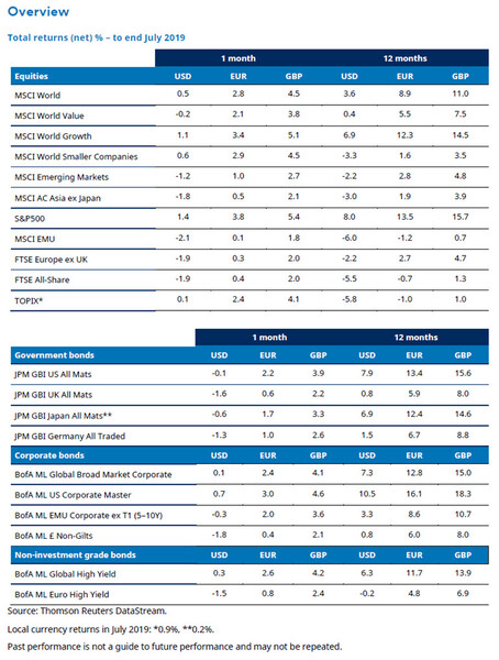 - Shares in developed markets gained in July but emerging market shares fell amid US dollar strength. Government bond yields fell (i.e. prices rose), while corporate bonds outperformed.