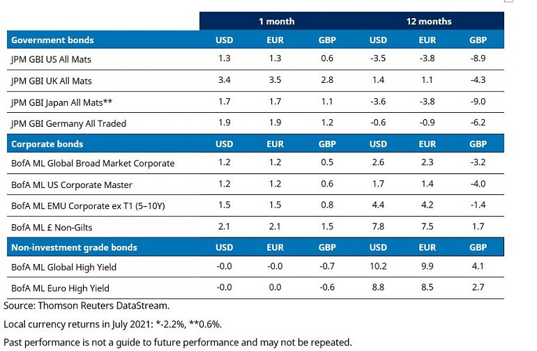 Government bond yields declined in July (meaning prices rose), as concerns over the Covid-19 Delta variant and signs of global growth moderating caused investors to shift toward safer investments. While the economy continued to recover, with lockdown measures increasingly lifting, there were signs of the growth rate slowing, particularly in China.