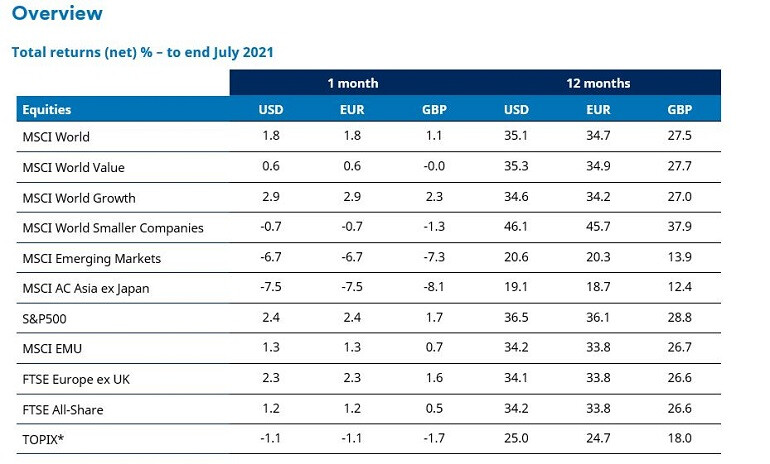 UK equities rose over July, although many defensive large cap overseas earners performed poorly, partly due to sterling strength against both the US dollar and the euro. It was a volatile period as markets initially sold off in the first part of the month amid ongoing fears around the global growth outlook and the spread of the Delta Covid-19 variant.